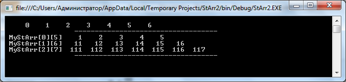 У наступному рядку коду елементу масиву jagged[0] присвоюється посилання на масив розмірами 4:2. jagged[0] = new int[4, 2];