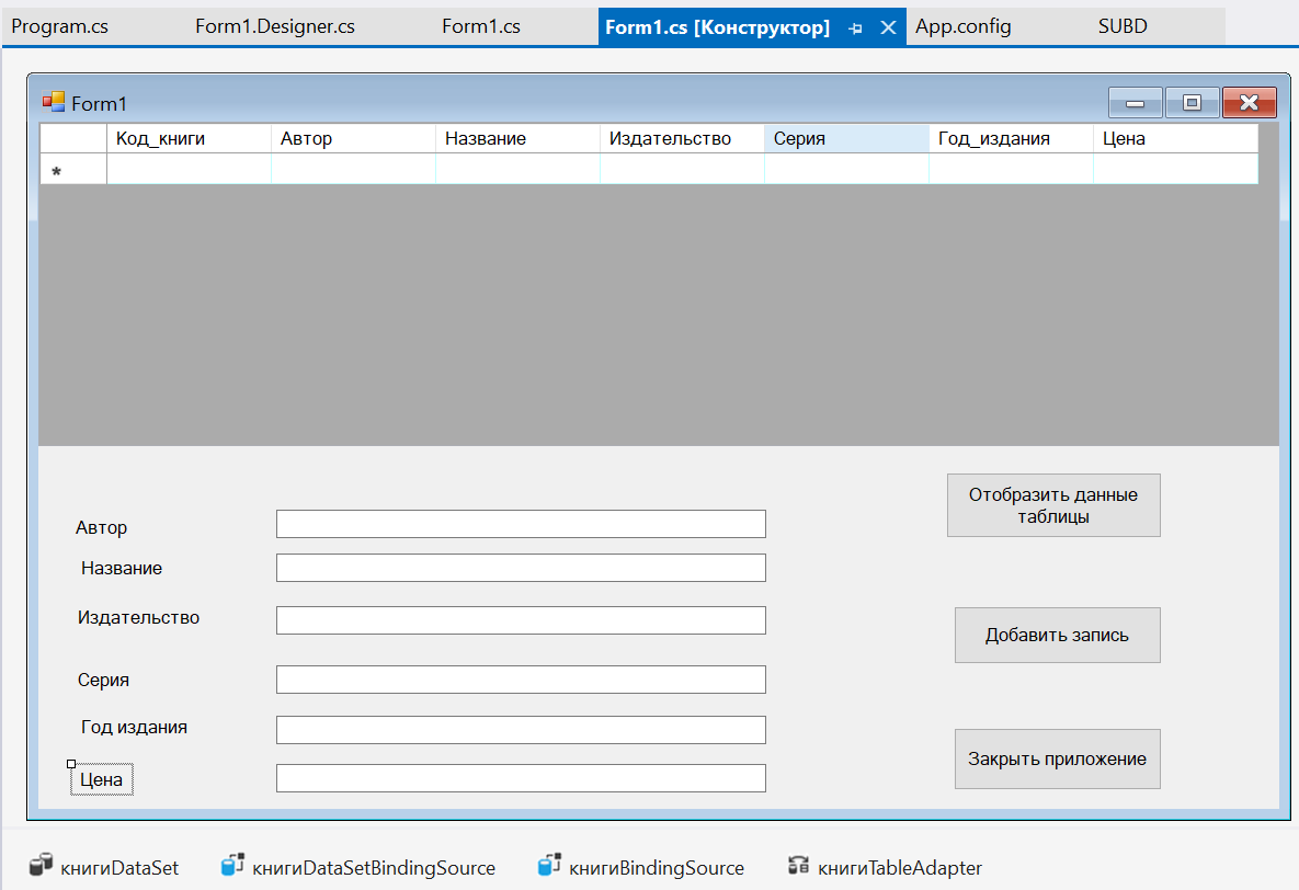dataGridView1.DataSource = книгиDataSet.Tables["Книги"];