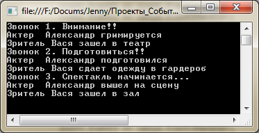 До об'єкта класу Telephone (телефон) застосовують метод, що генерує подію Event1. Обробник цієї події з класу Subscriber видає повідомлення та генерує одну з двох подій: Event2 або Event3.