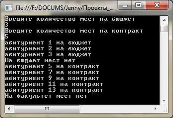 - Викликати метод, який моделює вступ абітурієнта на контракт, якщо є місця або генерує другу подію, якщо місць немає.