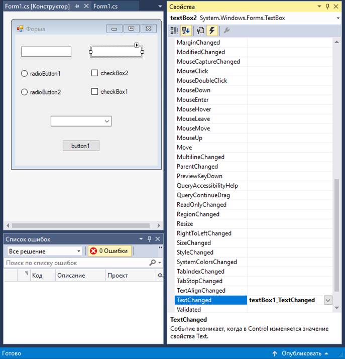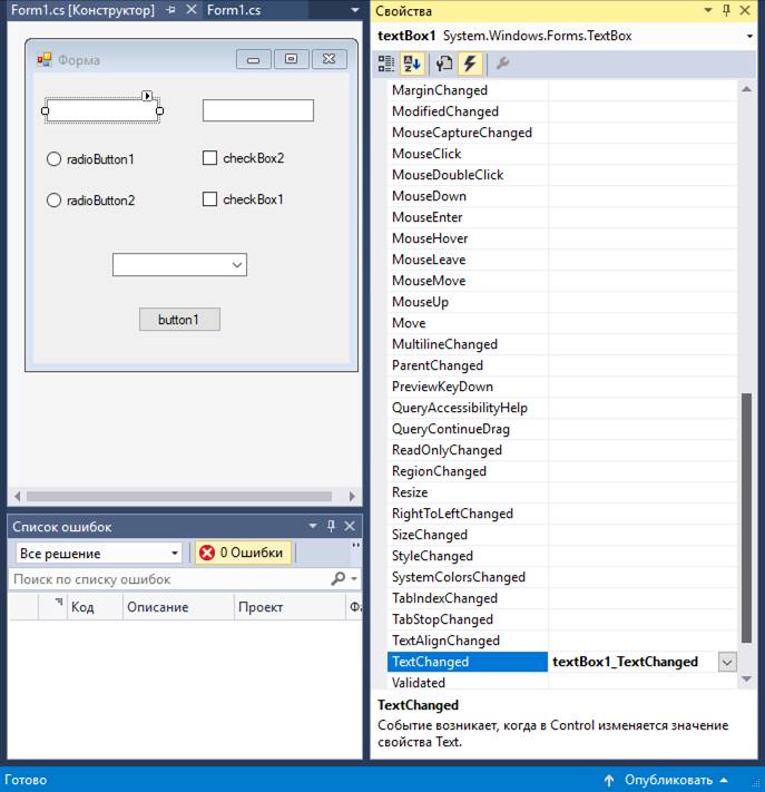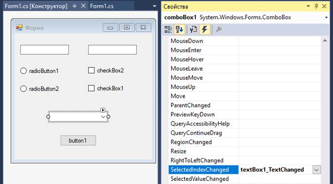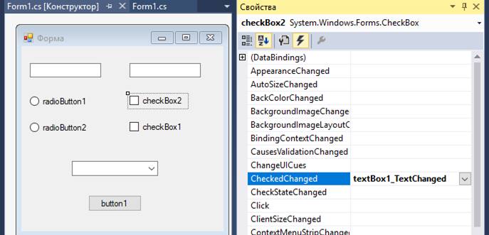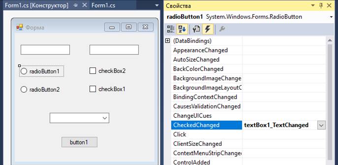 Наприклад, обробник textBox1_TextChanged прив'язаний до відповідних подій для всіх елементів нашої форми. А саме: