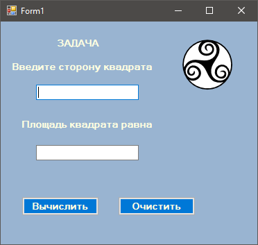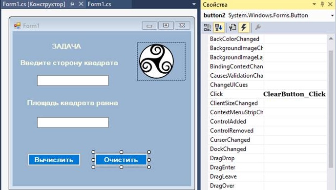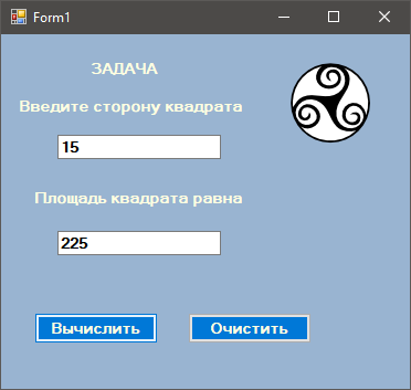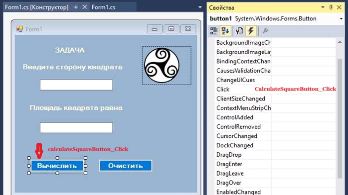 Обробник події Click кнопки calculateSquareButton повинен зчитувати число з поля textBox1, обчислювати площу квадрата і записувати результат в елемент textBox2.