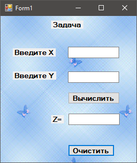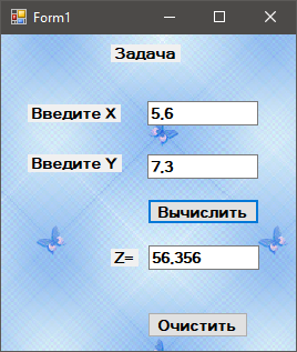 Обробник події Click для кнопки calculateButton має зчитувати X з поля textBox1, Y з поля textBox2, обчислювати Z і записувати результат у елемент textBox3 з точністю до трьох знаків після коми.