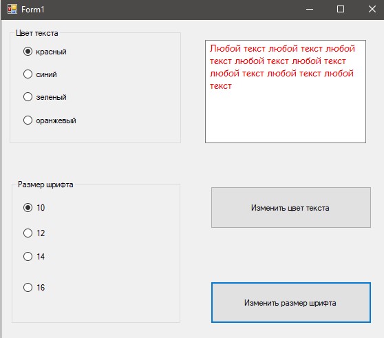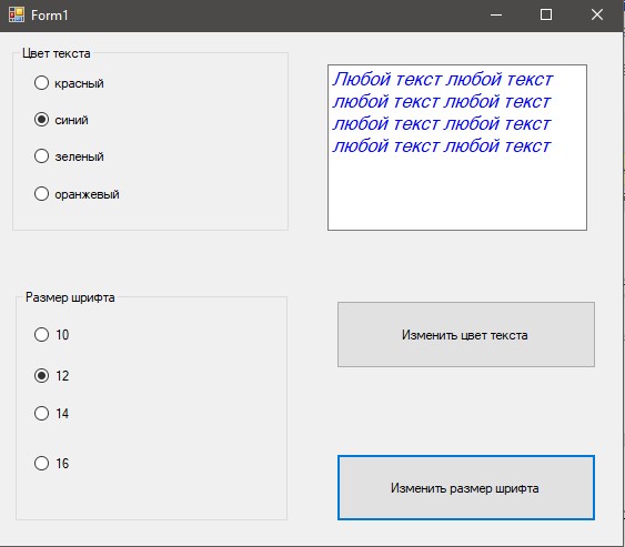 Користувач за допомогою двох груп радіокнопок вибирає колір та розмір для тексту в textBox. Для розміру 12 додає нахил, а для розміру 14 нахил та фон.