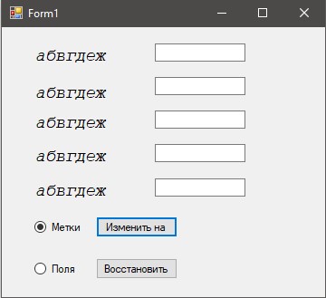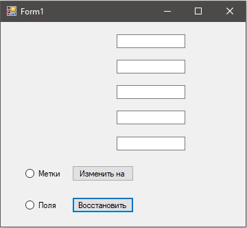 На формі: 5 міток (порожніх), 5 текстових полів, 2 радіокнопки для вибору завдання (змінювати мітки або поля), 2 кнопки: "Змінити" і "Відновити".