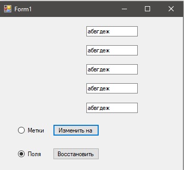 Якщо вибрати радіокнопку "Поля" і натиснути кнопку "Змінити", то в усі текстові поля повинен вивестись рядок "абвгдеж".