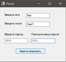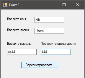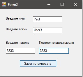 Якщо в головній формі натиснути кнопку Реєстрація, відкривається форма Form2, яка після заповнення і натискання кнопки Зареєструвати, додає нового користувача до списку зареєстрованих користувачів і закривається.