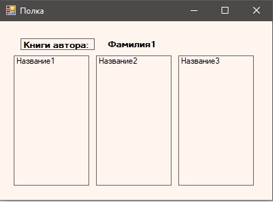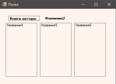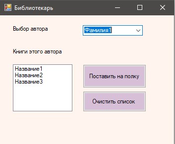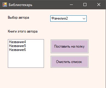 Для цього переглядається список книг на головній формі і на полицю поміщуються книги, у яких прізвище автора збігається з прізвищем, вибраним на формі Бібліотекар. Для цього і використовується властивість ComboBox1 класу Form2.