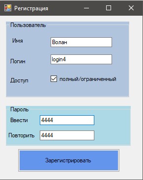 На формі Реєстрація вводимо дані про нового користувача: ім'я, логін і двічі пароль. Якщо реєструємий користувач буде мати повний доступ, то вибираємо checkBox1, якщо доступ буде обмежений, то не вибираємо. Далі шукаємо такого користувача в уже створеному списку List зареєстрованих користувачів.