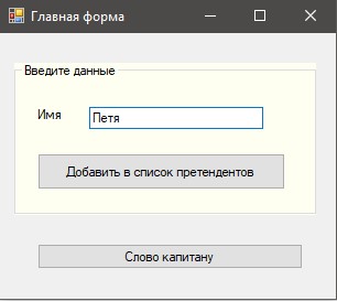 Призначення форми: сформувати список List імен претендентів. У текстове поле вводиться ім'я. При натисканні кнопки "Додати до списку претендентів" введене ім'я дописується до списку. При натисканні кнопки "Слово капітану" відкривається форма Капітан, яка повинна використовувати створений список List.