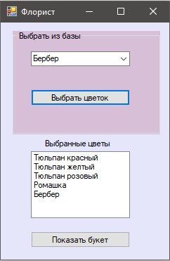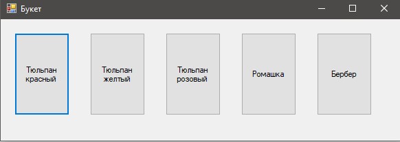 Призначення форми: створити і вивести на екран кнопки з назвами квітів. Назви вибираються з елемента listBox на формі "Флорист". Розміри кнопок 80 на 120 пікселів.
