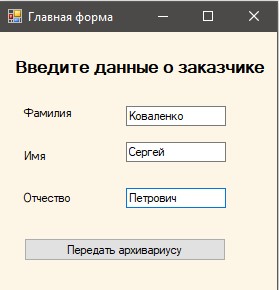 Призначення форми: сформувати об'єкт-замовника. При натисканні кнопки "Передати архіваріусу" відкривається форма Архіваріус, яка повинна використовувати створений об'єкт.
