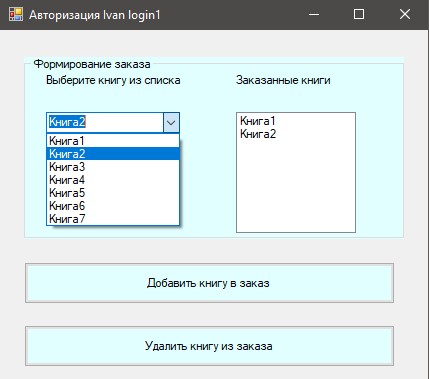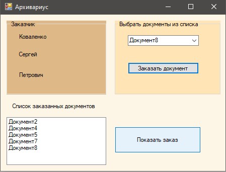 У елементі comboBox міститься стандартний список документів. При виборі елемента з comboBox і натисканні кнопки "Замовити документ" вибраний документ дописується в елемент listBox