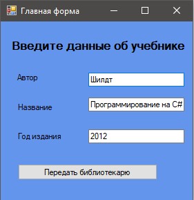 Призначення форми: сформувати об'єкт-підручник. При натисканні кнопки "Передати бібліотекарю" відкривається форма Бібліотекар, яка повинна використовувати створений об'єкт.
