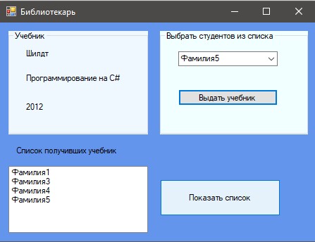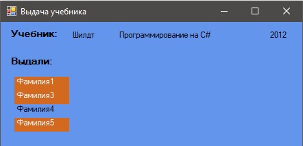 У елементі comboBox міститься стандартний список прізвищ учнів. При виборі елемента з comboBox і натисканні кнопки "Видати підручник" вибране прізвище дописується в елемент listBox