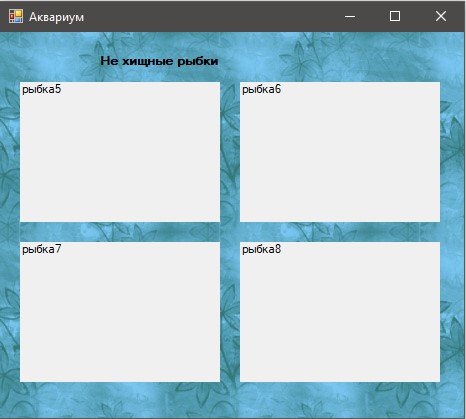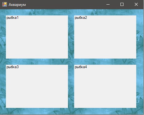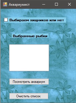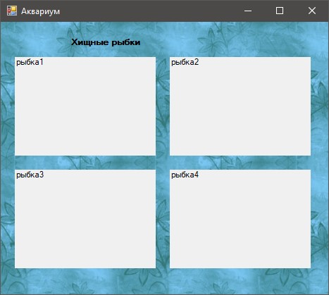 Призначення форми: створити і вивести на екран елементи Label з назвами рибок. Назви вибираються з елемента listBox на формі "Акваріуміст".