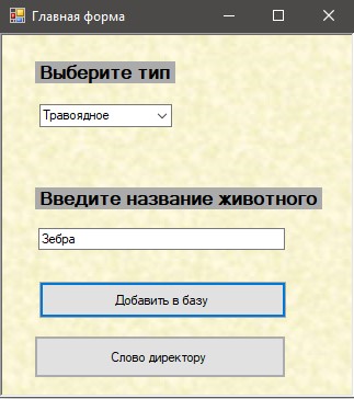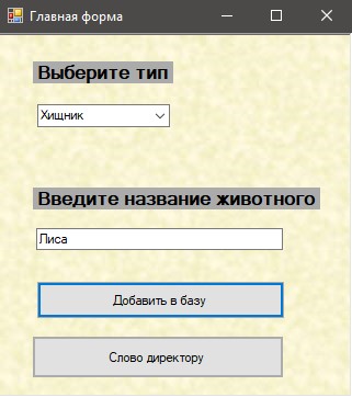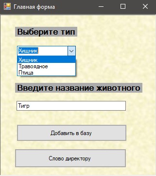 Зі списку ComboBox вибирається тип тварини. У текстове поле вводиться назва тварини.