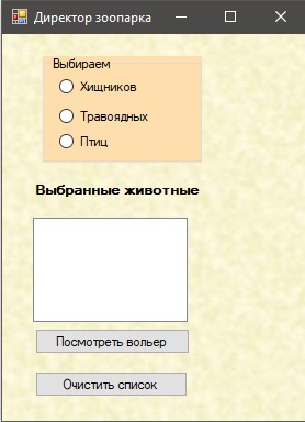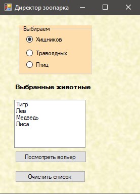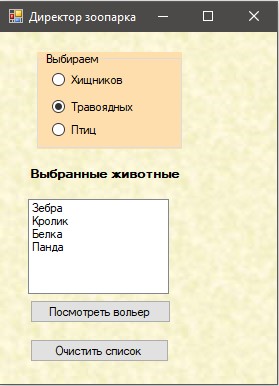 При натисканні на радіокнопку, в елемент listBox зі списку List, сформованого на Головній формі, вибираються назви всіх відповідних тварин зі списку List