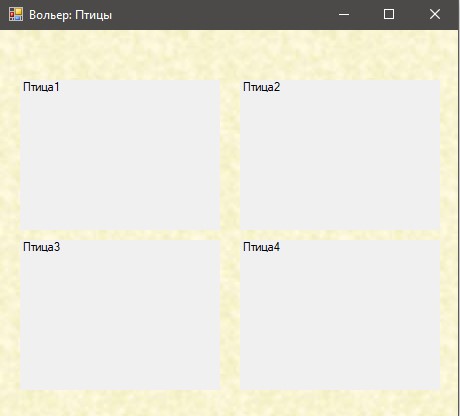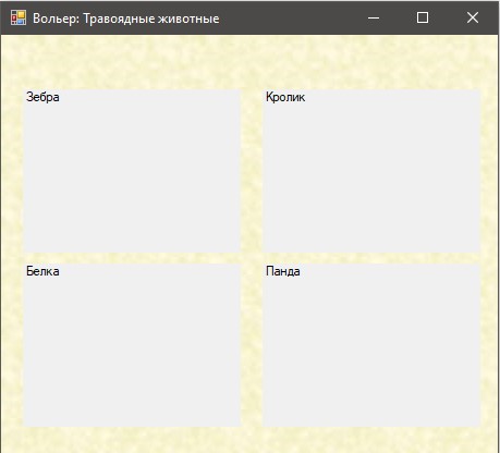 Призначення форми: створити і вивести на екран елементи Label з назвами тварин, які знаходяться в елементі listBox на формі Директор зоопарку. Елементи розмістити в два стовпчики. Розміри елементів 200 на 140 пікселів.
