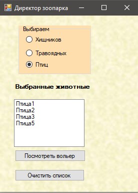В заголовку вікна має з'являтись один з надписів: "Хижі тварини", "Травоїдні тварини" або "Птахи", залежно від того, яка радіокнопка була вибрана на формі Директор зоопарку.