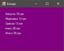 Призначення форми: створити і вивести на екран елементи Label з назвами і вартістю продуктів, а також розраховувати загальну вартість страви. Назви вибираються з елемента listBox на формі "Кухар", а вартість зі списку продуктів list на головній формі.