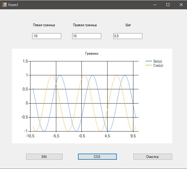 При натисканні кнопки SIN будується графік функції y=sin(x). При натисканні кнопки COS будується графік функції y=cos(x).