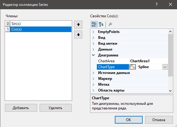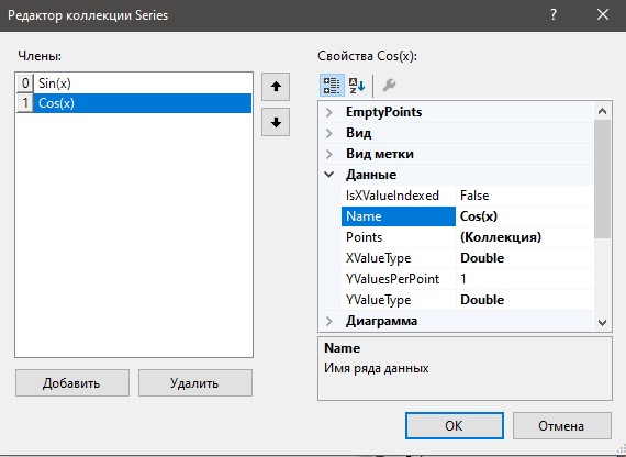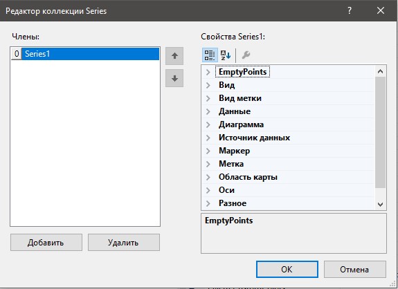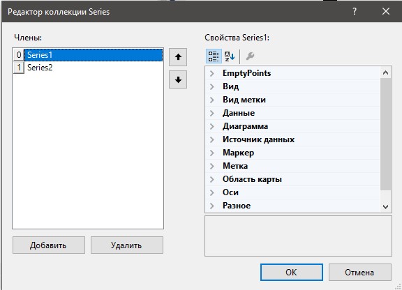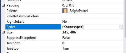 Змінимо властивість Series для елемента chart1. Ця властивість описує серії даних, за якими ми будемо будувати графіки. Для цього натисніть на кнопку "...".