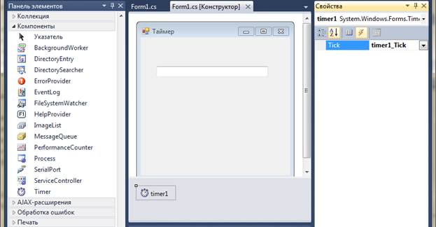 Значок таймера з ідентифікатором timer1 буде показаний у нижній частині вікна дизайнера форми.