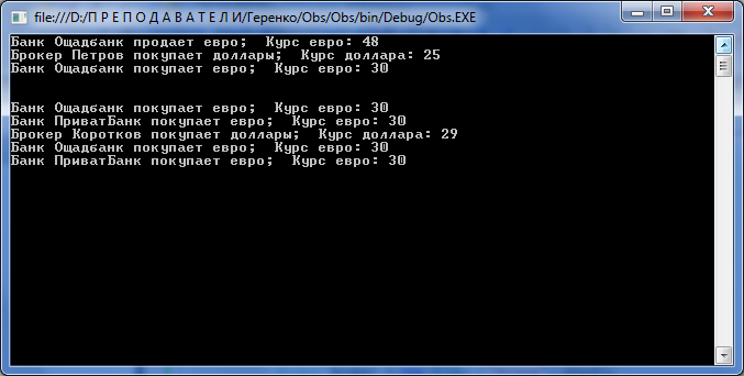 Реалізація цього методу передбачає отримання через цей параметр об’єкта StockInfo з актуальною інформацією про торги і виконання деяких дій: купівля або продаж доларів і євро. Справа в тому, що часто потрібно інформувати спостерігача про зміну стану спостережуваного об’єкта.