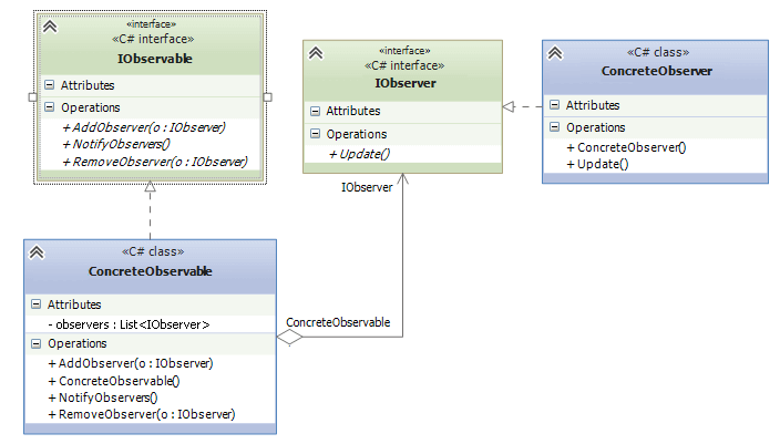 Тут спостережуваний об’єкт представлений інтерфейсом IObservable, а спостерігач — інтерфейсом IObserver.