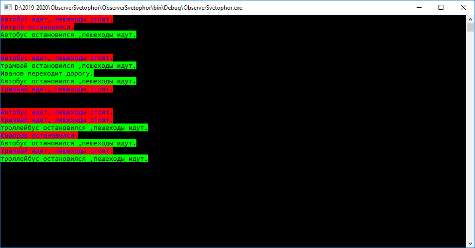 Реалізацією інтерфейсу IObservable є клас TrafficLightSingleton, який символізує світлофор. У цьому класі визначити метод ChangeLight(int i), який імітує зміну світла. Після зміни світла відбувається повідомлення всіх спостерігачів (пішоходів та водіїв транспортних засобів).