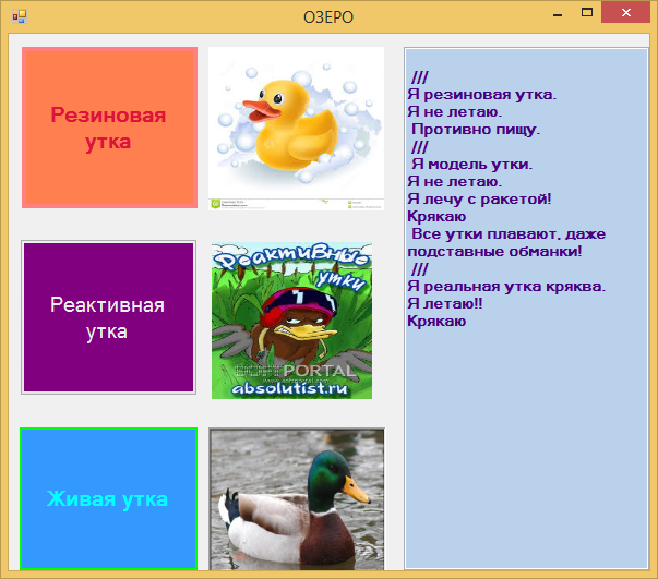 Визначається суперклас Duck, а на його основі — підкласи конкретних качок.