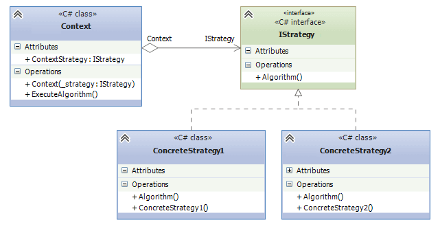 Є інтерфейс IStrategy, що визначає метод Execute(), реалізований у конкретних стратегіях ConcreteStrategy1 і ConcreteStrategy2, кожна з яких виконує Execute() по‑своєму.