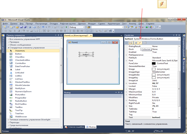 Для того щоб призначити обробник події для виділеного елемента, використовують панель подій.