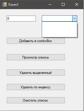 На формі знаходиться текстове поле, елемент comboBox1 і 5 кнопок.