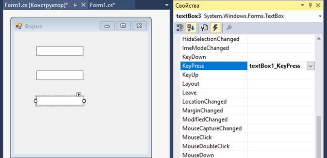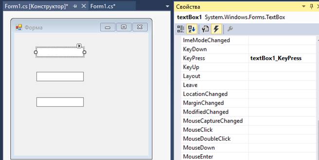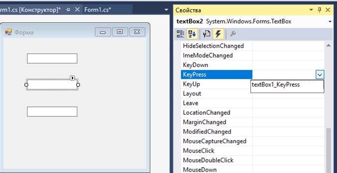 Наприклад, був створений обробник події KeyPress для елемента textBox1. Він за замовчуванням названий textBox1_KeyPress.